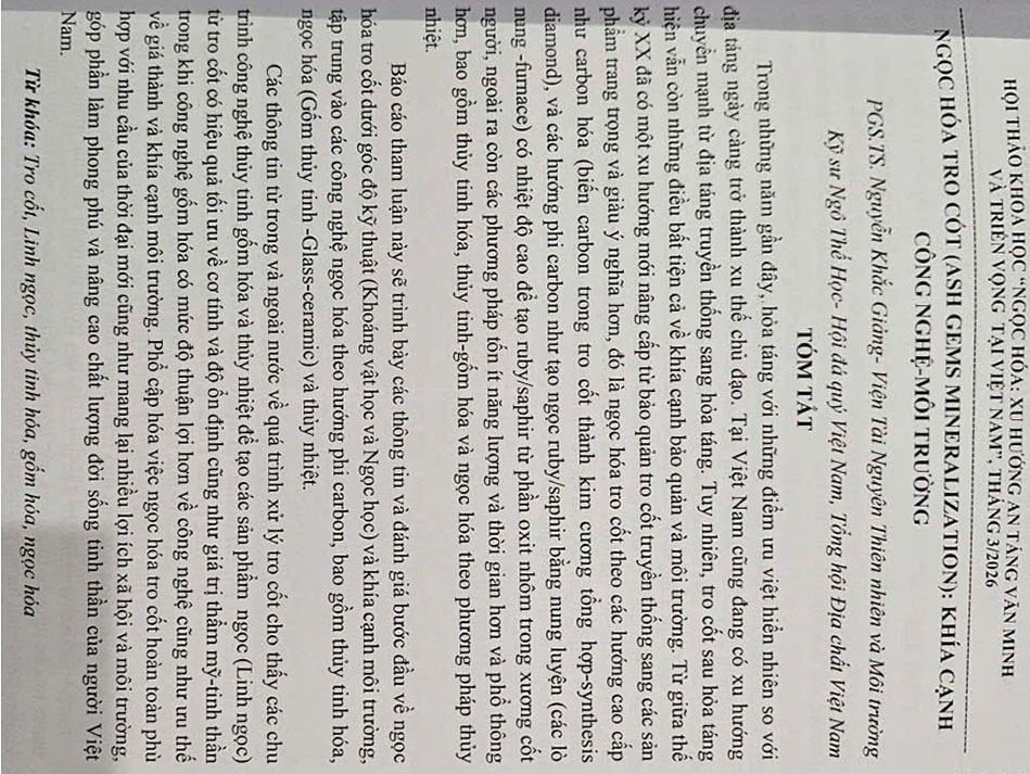 Tại Hội thảo, đại diện Viện Tài nguyên Thiên nhiên và Môi trường PGS.TS Nguyễn Khắc Giảng có bài báo cáo “Ngọc hoá tro cốt: Khía cạnh công nghệ môi trường”. Báo cáo trình bày các thông tin và đánh giá về ngọc tro cốt dưới góc độ kỹ thuật (Khoáng vật học và Ngọc học) và khía cạnh môi trường, tập trung vào các công nghệ ngọc hoá theo hướng phi carbon, bao gồm thuỷ tinh hoá, ngọc hoá (gốm thuỷ tinh) và thuỷ nhiệt. Từ đó đánh giá triển vọng áp dụng các công nghệ tại Việt Nam.